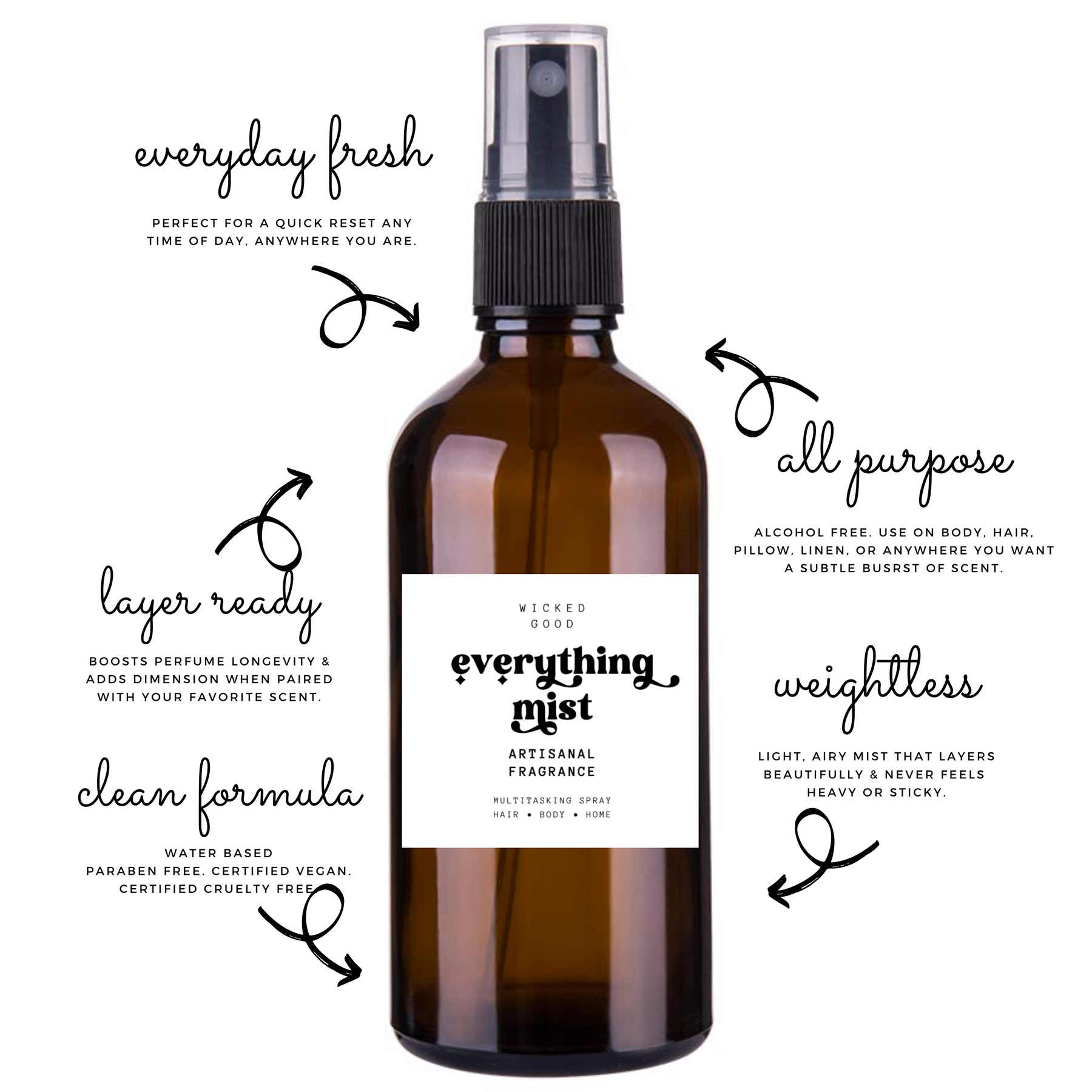Think of this as fragrance freedom. A soft, alcohol free mist that you can spray on skin, hair, clothing, rooms, linens, cars: literally everywhere. Lighter throw, buildable intensity. Want to make your world smell incredible without overwhelming a space? Everything Mist is it. It’s the layering hero for people who love versatility & movement throughout the day.